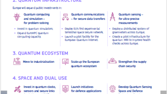 The strategy focuses on five key areas: expanding research and innovation, building quantum infrastructure such as chip pilot lines and a secure quantum internet, strengthening the quantum ecosystem with better support for start-ups, integrating quantum into space, security and defence, and boosting education through a European Quantum Skills Academy launching in 2026.