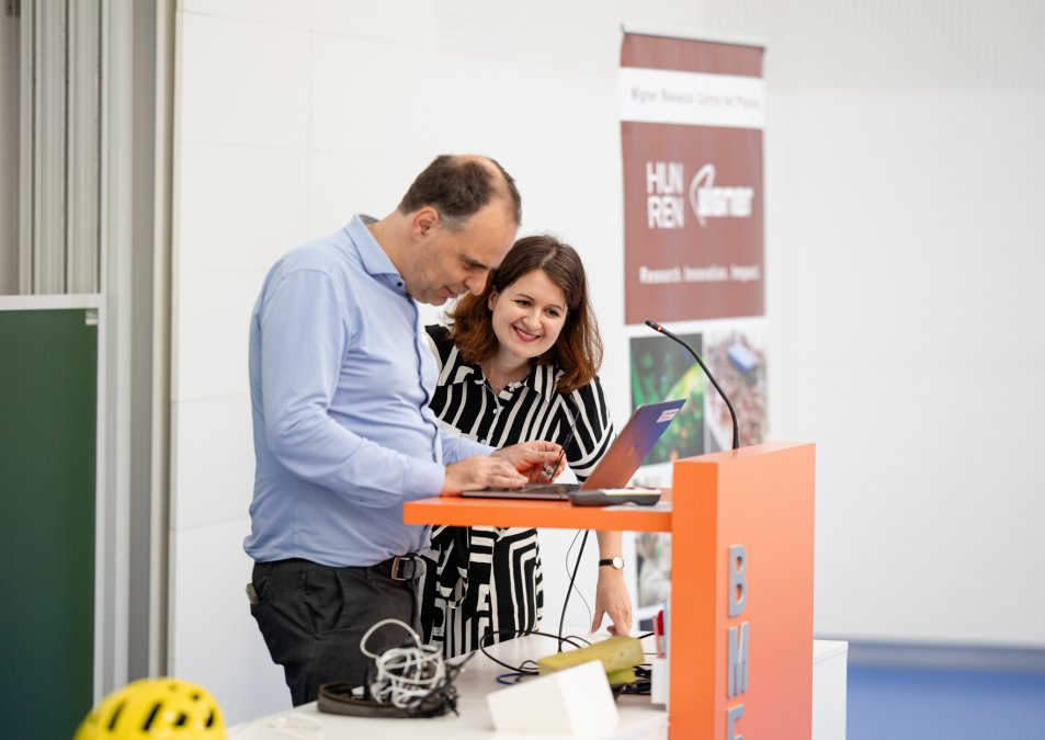 Project coordinator Frank Wilhelm-Mauch (FZJ) and project manager Antonija Zrno Ćulap (RISE) at the podium in the main conference hall – © BME / Berci Geberle
